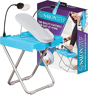 Includes lighted magnifier and drying fan to make nail care easier. This item Salon Step The Beauty Footrest for Easy At-Home Pedicures Treat Your Feet No More Bending or Stretching with LED Magnifier Drying Fan Adjustable Foot Rest Non-Slip Sturdy Legs Built-In Storage. Folds for easy storage.